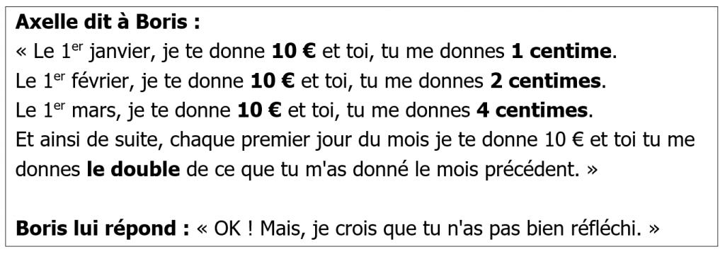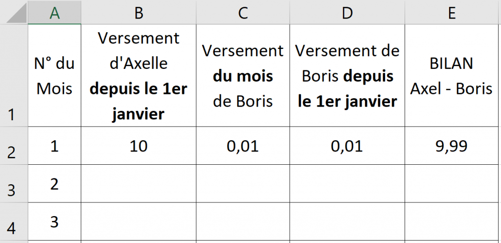 Voici une feuille de calcul qui va nous permettre d’étudier les sommes gagnées par Axelle et Boris au fil des mois.