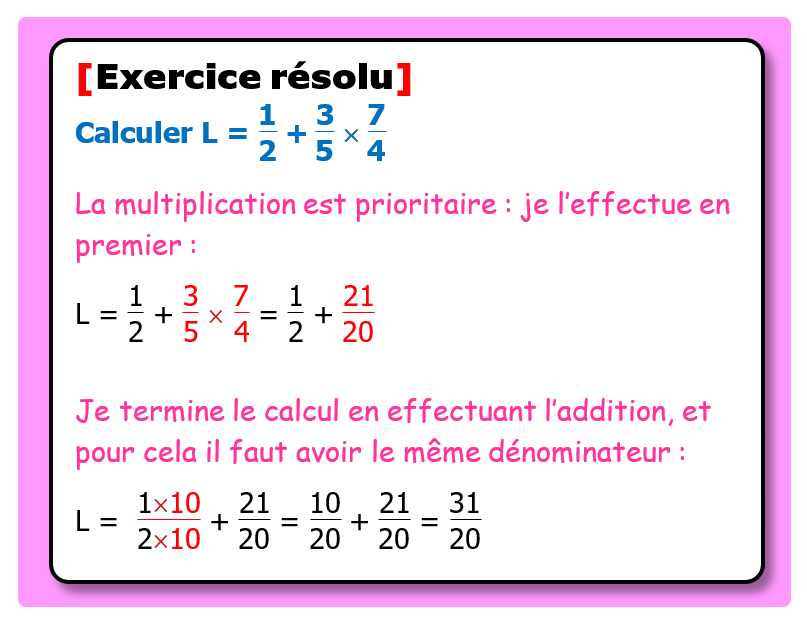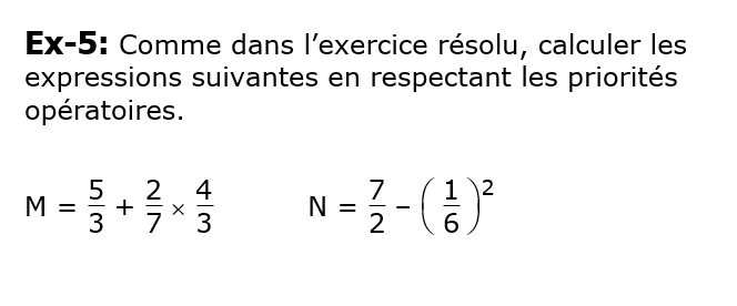 ►Étape 3 : Expressions comprenant addition soustraction et produit: Attention aux priorités opératoires. Faites l’exercice 5 en vous inspirant de l’exercice résolu ci-dessous.