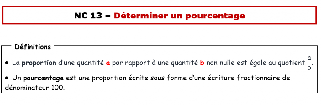 ►Étape 1 : Compléter les définitions ci-dessous sur la fiche donnée en classe « NC13 – Déterminer un pourcentage« .